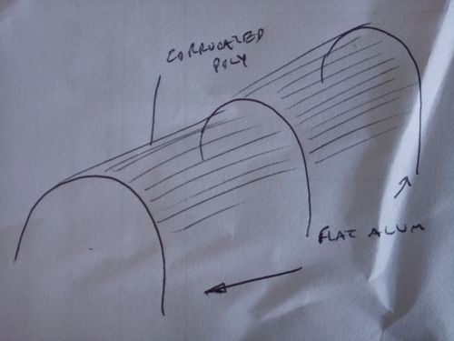 I'm building a long green house, I'm going to use corrugated poly as the roof mounted to flat aluminium hoops (see sketch). My 2 questions are: