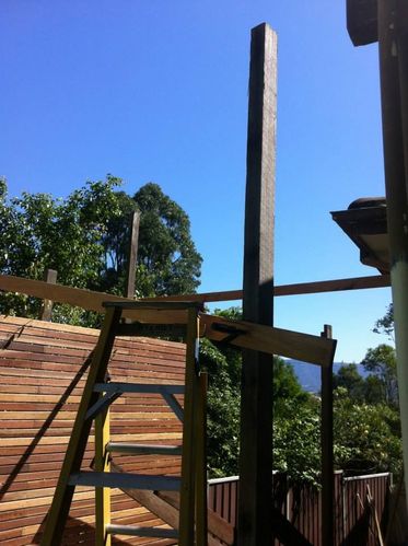 So you can see the two middle posts are standing. These actually dont connect and were meant to be chopped off. I decided to leave them there for the time being as I was going to put a handrail across the space and then that changed to a spa going in next to the deck, so not sure if it will be a step down or handrailed and a step down. Still to be done .... ![]()