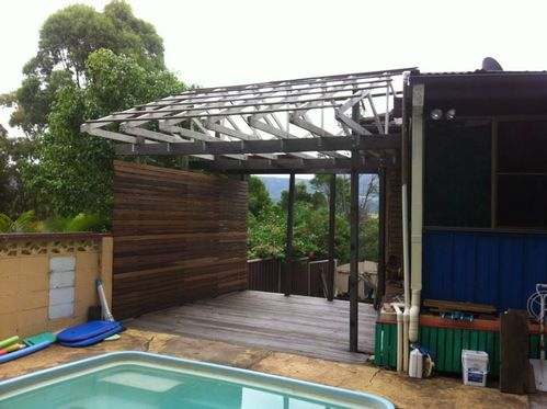 Having just finished the deck itself Pool deck stage 1 I really wanted to start boxing in the area. I had sourced the trusses from a recyled timber place (It has since closed its doors)