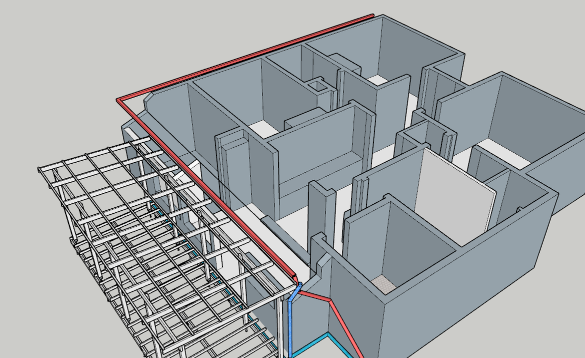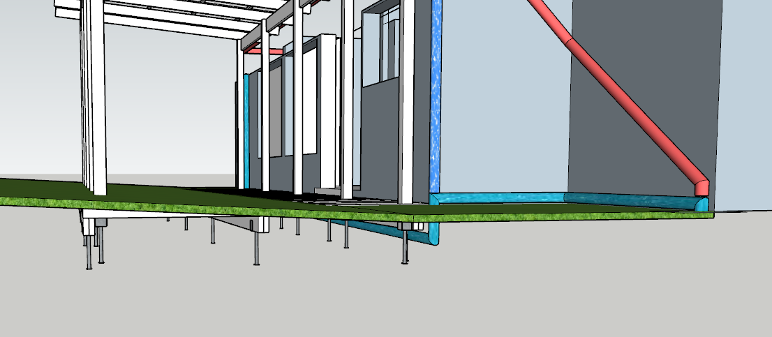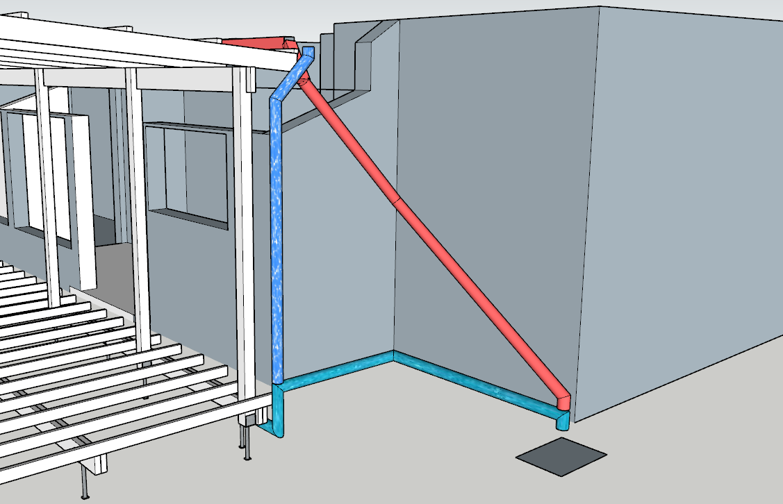 I'm planning to build this pergola and decking. The house currently does not have enough downpipes so I wanted to add at least one (or maybe two) to the left as part of the building project. The only drain I have access to is on the right hand side. To hide the stormwater pipes I am wanting to run them underneath the decking but this will mean that the water will have to run verticle for like 500mm (see the pic of the right hand side) before going horizontal and out to the drain. To achieve this I am going to use a "charged line" where the run of stormwater pipes underneath the decking has a fall of 1%.