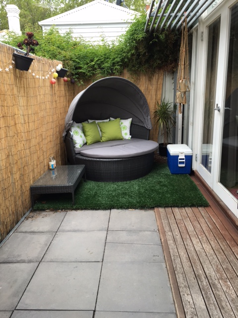 My husband comes from the countryside so he wanted some green in the garden. Neither of us are great keeping plants alive so decided to go with some fake turf tiles and a palm that both are easy to maintain and look pretty good we think!