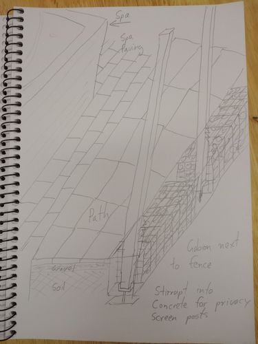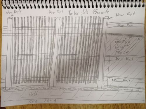 I am going to install vertical posts with timber slats as a screen from my neighbours. Here are some sketches Ive done with what I am thinking of doing. You could do the same with the posts in gabage can's (GC's) and only have slats teh top 600mm.