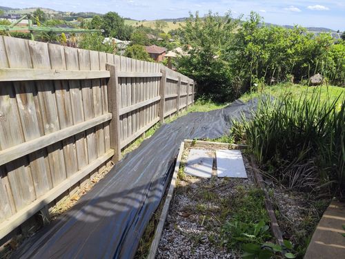 We are on a sloping block, after months of mowing on steep slope, we decided to put weedmat on a section of it.