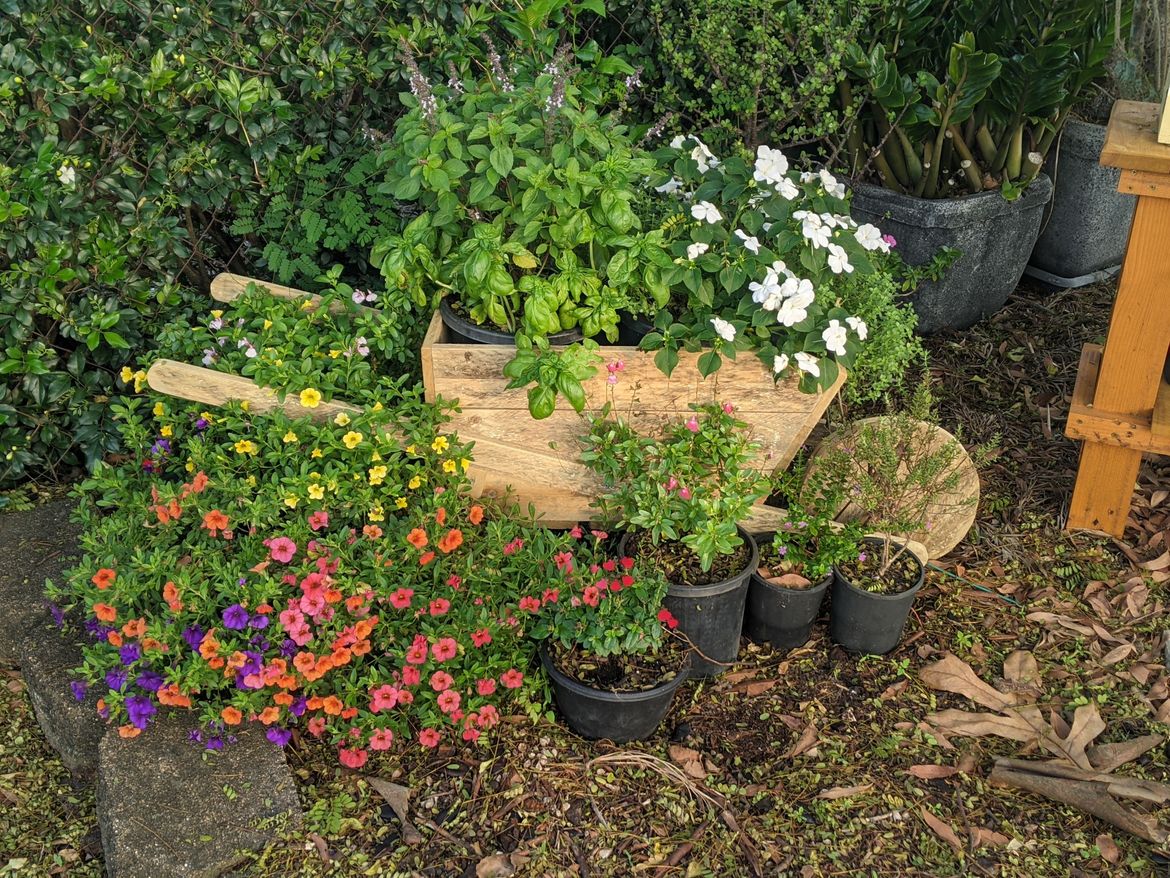Photo shows the wheelbarrow setup. Potted plants can be changed with seasons.