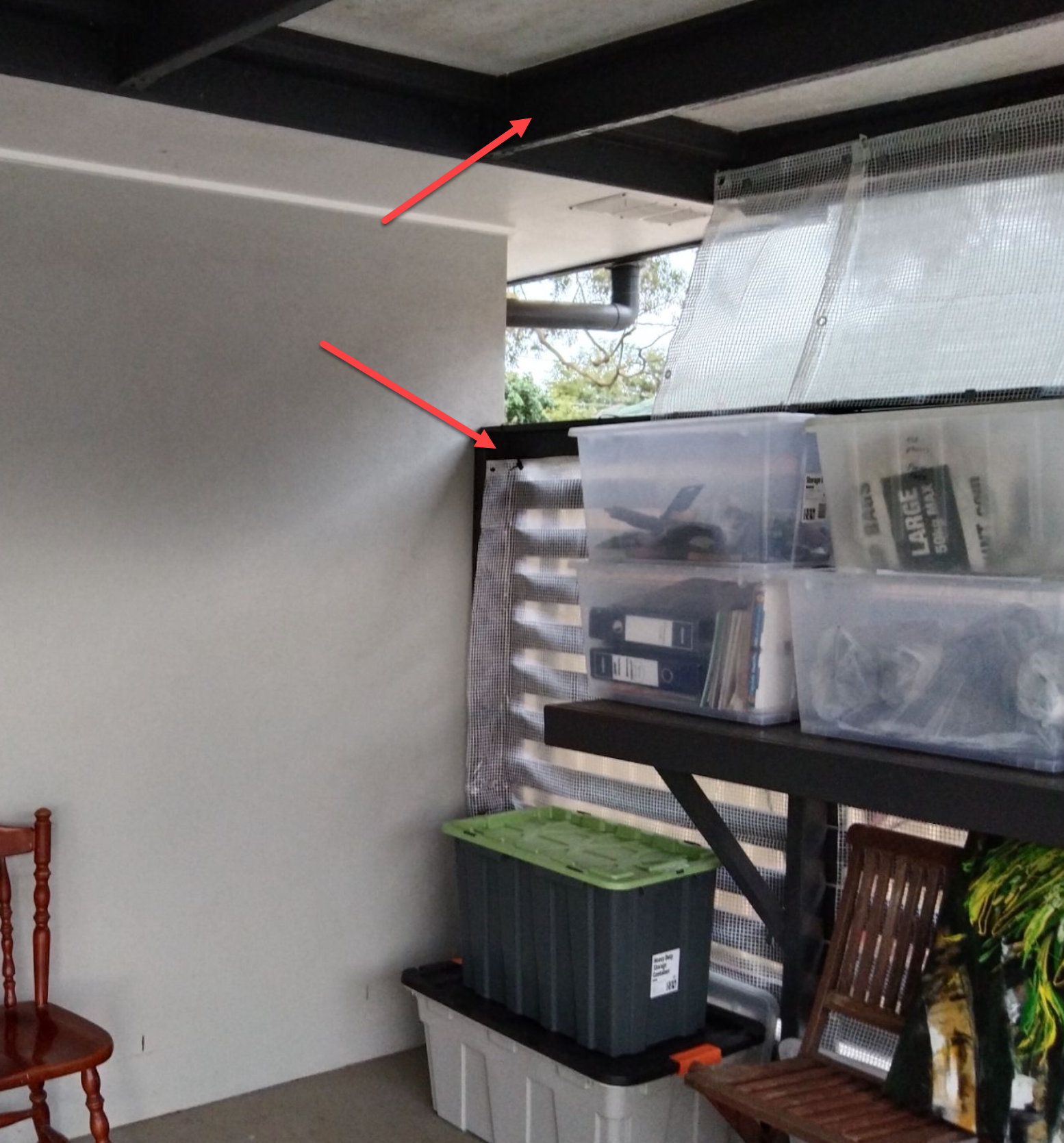 Perhaps the only solution is to reinforce the existing clear tarp with some extra pieces, as there seems to be nowhere for the polycarbonate to attach to at the top where it's needed. The clear tarp is attached with shade cloth timber studs.