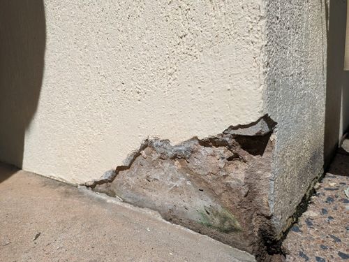 At the bottom of the house corner, some render but also some of the concrete foundation has come off as it looks. The bottom corner of the first brick ...