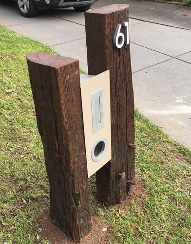 Rolando attached a metal unit to railway sleepers with reclaimed items, creating a stylish letterbox with rustic charm.