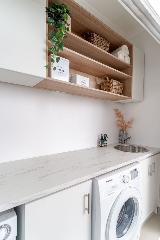 Experienced Bunnings Workshop community member Rufaro (@diy_hausdesigns) brightened his budget laundry makeover with white walls, cabinetry and benchtop.