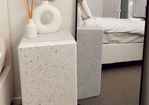 Adding, upcycling or replacing furniture can be a quick and easy way to refresh your bedroom. Laura (@lauraahearn) glued Terrazzo tiles onto MDF panels to create matching bedside tables.