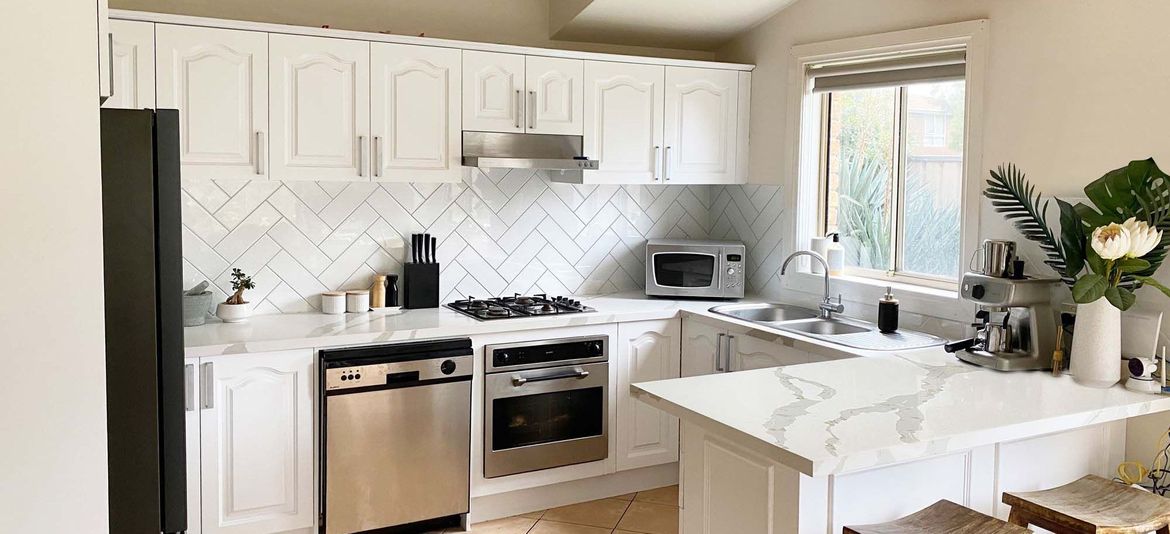 New benchtops, tiles and paint helped transform this kitchen.