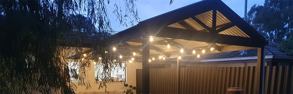 This Jarrah pergola adorned with festoon lights transformed a side yard into a stylish outdoor entertaining area.