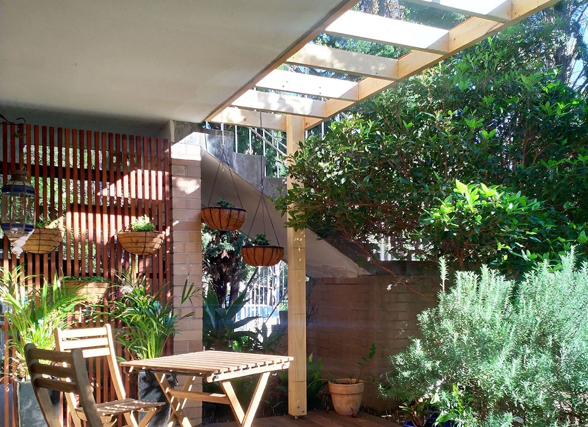 A Pine timber pergola installed over a garden courtyard, as part of a larger backyard renovation project.