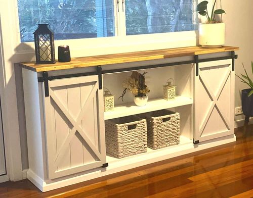 Conceal messy cables and wires and store your entertainment devices using a cabinet. Creative Workshop member @KMP added a Tasmanian Oak top and removed the cabinet’s centre drawers to transform it into a sleek TV unit.