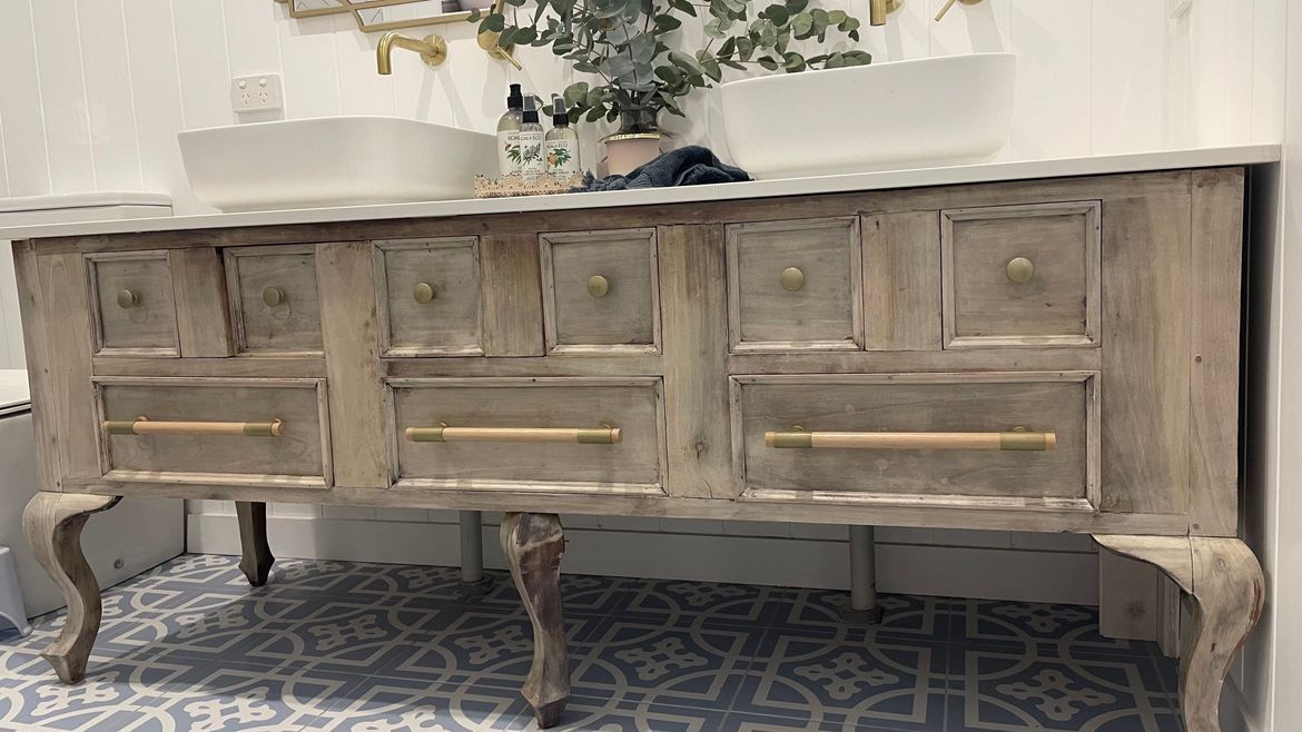 Make your bathroom more stylish and functional by adding a bathroom vanity. Claire (@Renowayoflife) stripped, sanded and bleached a large varnished cabinet before repurposing it as a bathroom vanity with new dual basins.