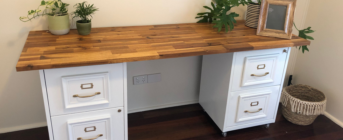 Cabinets are a great way to store office essentials and add more workspace. While upcycling a couple of dated filing cabinets, Elle (@ElleM) added new fittings and an Acacia panel on top to create a desk.