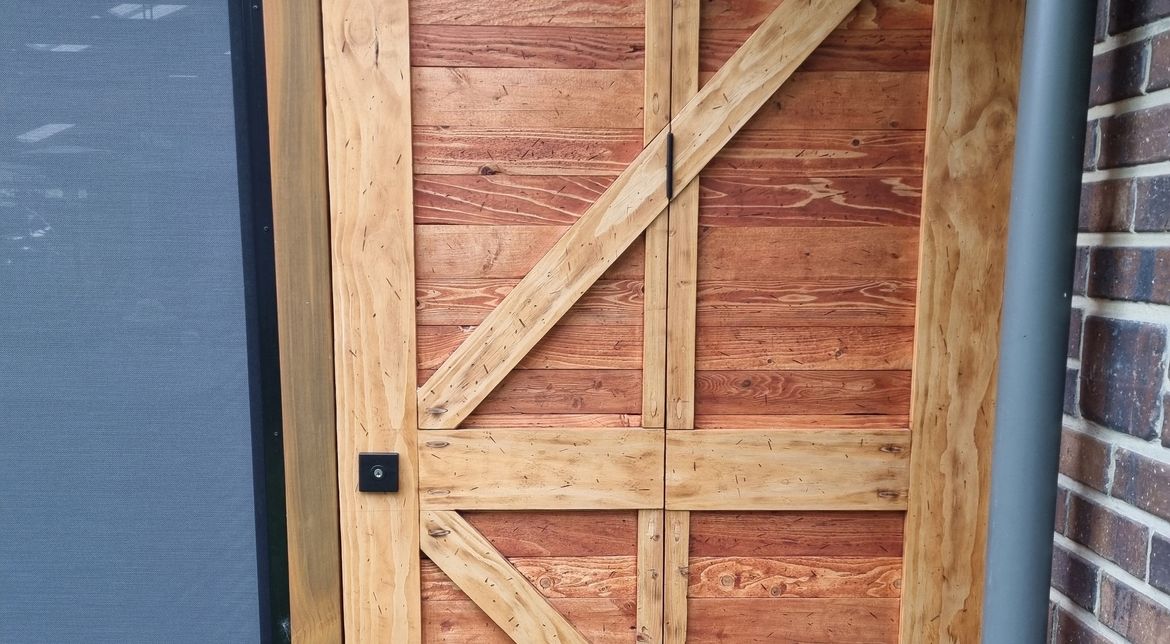 Tammie's first door build, this bifold was made using recycled pallet timber and fitted with a deadlock.