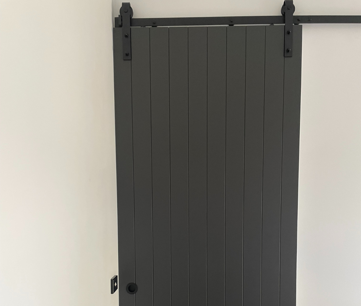Riley cut and aligned MDF pieces to create this stylish design and installed the barn door on a custom-built bulkhead.