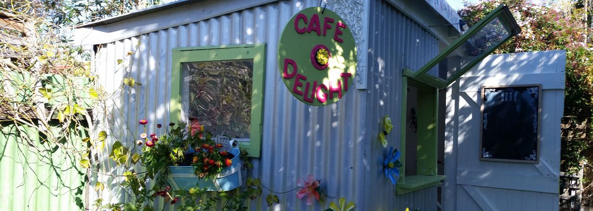 An unused garden shed transformed into a cubby house with a cafe theme.