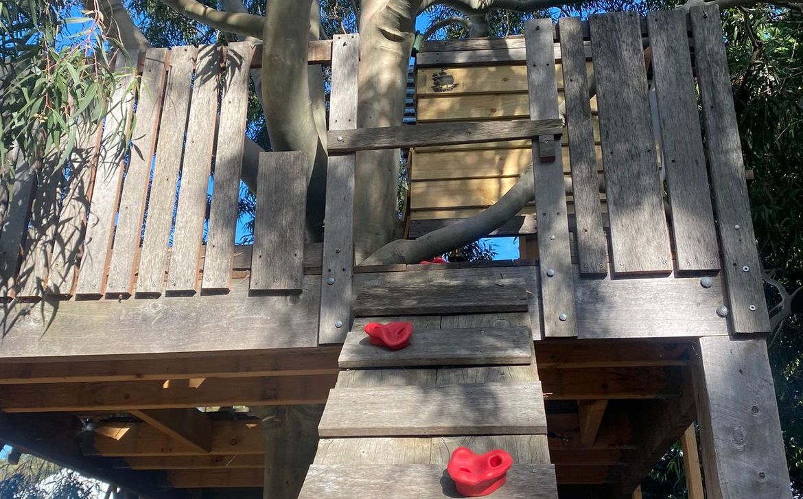 Crafted using an old pergola from a demolished house, the platform for this treehouse sits on a frame that avoids the need to dig post holes that would have impacted the Lemon-scented Gum tree's critical root zone.