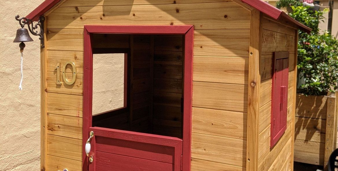 A Bunnings cubby was improved with additions such as a letterbox, phone, shelf, chalkboard, door bell, house number and flower decorations.