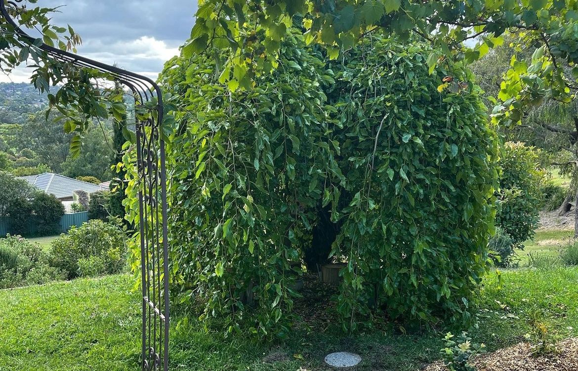A green cubby requiring no-construction by simply using Mulberry trees to create a secret play area.