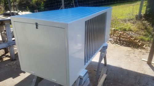 Treated Pine and Colorbond sheeting used to make a dog house with a porch as a first-time D.I.Y. project.