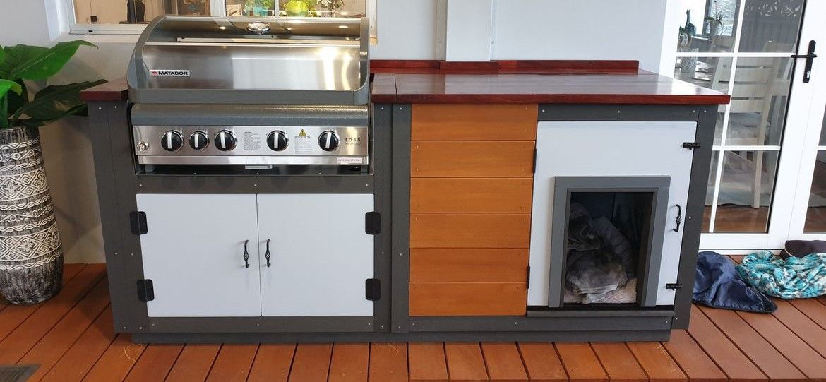 This timber barbecue stand includes a built-in dog kennel.
