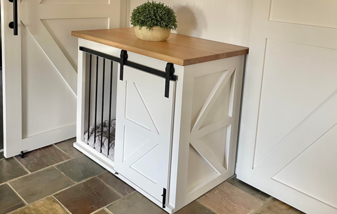 Recycled Pine, reinforced steel bars, barn door tracks and a hardwood benchtop used to build a dog crate cabinet.