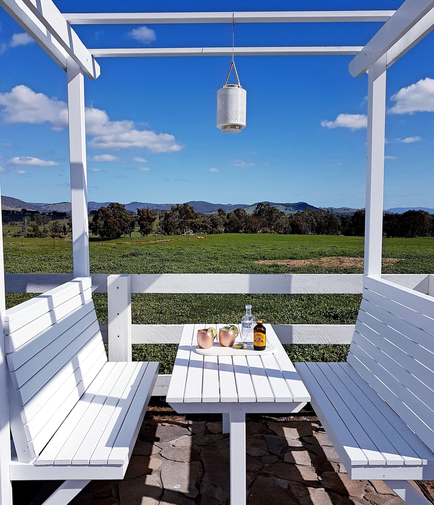 A pre-cut Softwoods pergola kit from Bunnings was assembled and customised with shiplap panelling, paint and bunker lights.