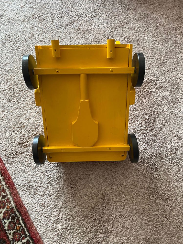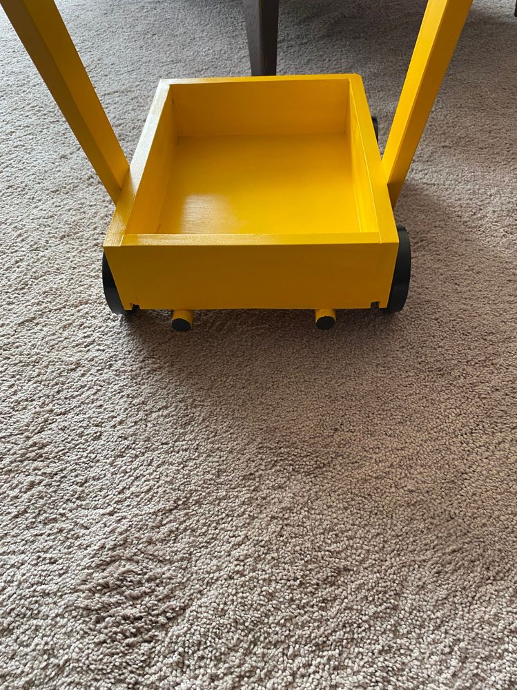 the wheels I cut out off pine drawing a circle with a compass and cutting with my Ryobi jigsaw . They’re screwed into the two axles underneath (again scrap pine approx 25x25mm and sanded round so that each is pretty close to the others. Actually a bit of a wobble may make it more fun. I drilled a 4mm hole through the centre mark of the compass to allow the wheel to spin on the screw and used stainless steel screws 65mm .
