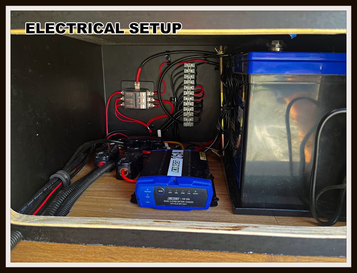 A 100AH Lithium battery runs all the electrics which is charged from the vans battery as well as the solar panel on the roof.