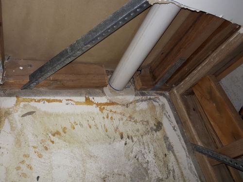Also, note the darker-coloured timber on the board behind the pipe. This could indicate dampness or that it was affected by moisture at some point. Stick your nose up against those darker patches on the board, especially in the corner, to see if it's the area where the funkiness is emanating from.