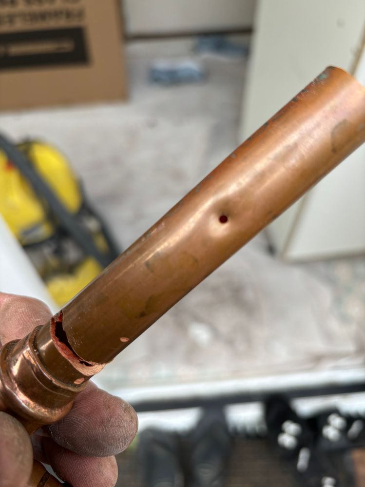 A thin 16Ga brad fixing the external sheet had pierced through 12mm of fibre cement, then about 15mm of hardwood stud and through the copper gas pipe. I wouldn't have thought that gauge brad could do it but it did.