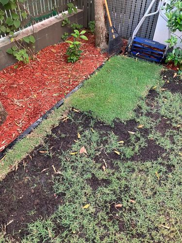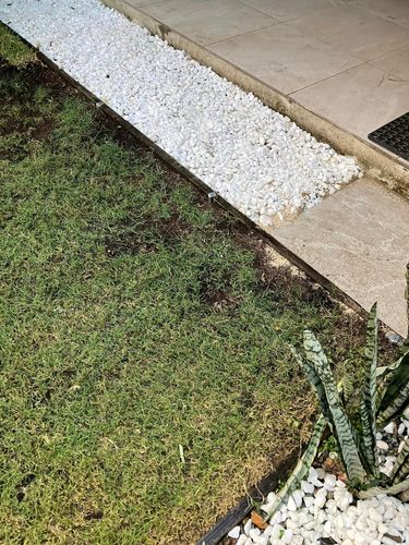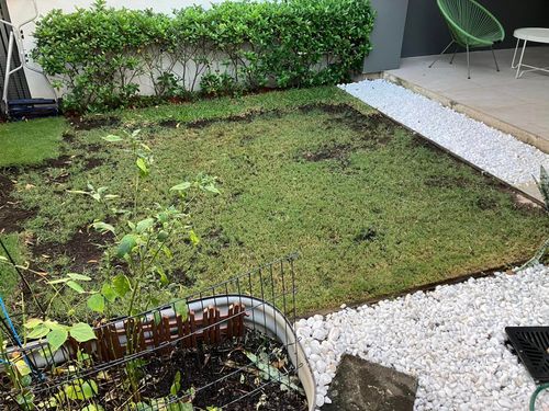 We had a problem with the court yard, where in heavy rain, the rain fall from the roof would make the ground would destroy the grass and then weeds would grow. So, I put in a gravel pebble path with one tile and gravel holders, reused the old edging and put in new timber edging with water proofing. I didnt use a weed mat as I wanted better drainage. Put some turf with seeds and not its looking way better. Its hard to grow grass here as my puppy and not enough sun light. so this is looking good now.