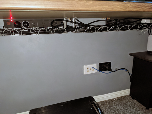 The Ethernet cord isn't my best work, but purchasing from a homeowner who went a little crazy with some DIY renos, I had few options, this (along with the power cord for the power board) is secured to the wall via a cobra large cord clip and goes to the back of the desktop via a 40mm hole cut out above the subwoofer stand.