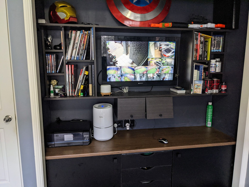 A custom built desk for the home office. Built pre - Covid, for home based projects and gaming, this desk was a lifesaver when the pandemic came around, allowing for both my wife and myself to work from home as easily as we would from an on site location. I highly encourage everyone to ensure they have a nice, relaxing home office space for school, work and relaxation.