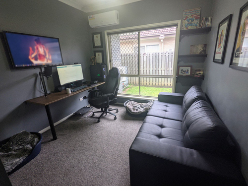Continuing on from a previous post regarding our DIY home office drawers, this is the custom desk that I built for working at home & gaming. It is 2 meters long and 600mm deep, allowing for plenty of desk space. The desk itself is secured to the wall using 30mm pine and various brackets, it's further supported by a taskmaster black steel table leg. Mounted on the wall is a 4k screen used as a secondary screen, the cables are hidden in a cable duct.