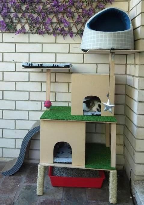 We built our cathouse with with mdf board, scared woods, artificial grass mat and a scratching board as a stairs.