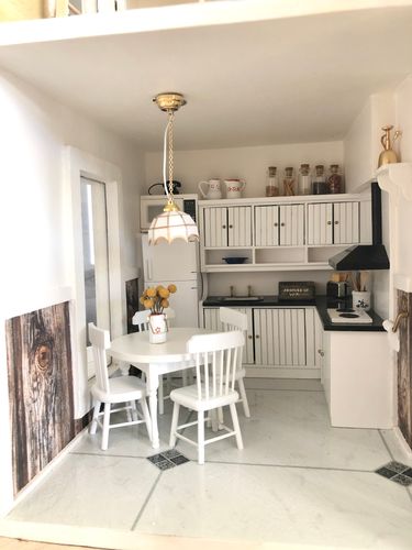 I used stick on vinyl tiles for the flooring and contact for the walls (all from Bunnings). For the skirting boards, panelling and roof tiles I used balsa wood of different sizes which I found in the craft section - also from Bunnings.