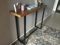 Using this ‘self isolation’ time to get a few jobs done around the house. One I’ve been trying to tackle for ages is our front entrance. Our furniture is Industrial/Rustic themed. So wanted to include this at the entrance to help create the feel throughout the whole house. The top is Hardwood Panel 1200 x 300 x 18mm. Stained 1 coat Classic Grey, 1 coat Walnut and finished with a clear varnish. Legs are Pine 30 x 30 @ 900 lengths. Sanded, primed and finished with gloss black spray paint. I stained a piece of pine moulding and attached to the edges to give the idea of thicker wood piece for the top. Was very easy to put together, only needed a couple cuts. The tedious part was staining but the hardwood panel was pretty much ready to go, only requiring minimal prepping. Overall fits area perfectly and exactly what we wanted.