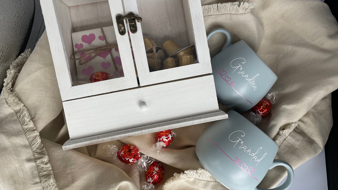 2 mugs which I picked up from Coles and personalised using my Cricut Joy. I added a cute decorative heart line leading from one cup to the other, it is valentines day after all.