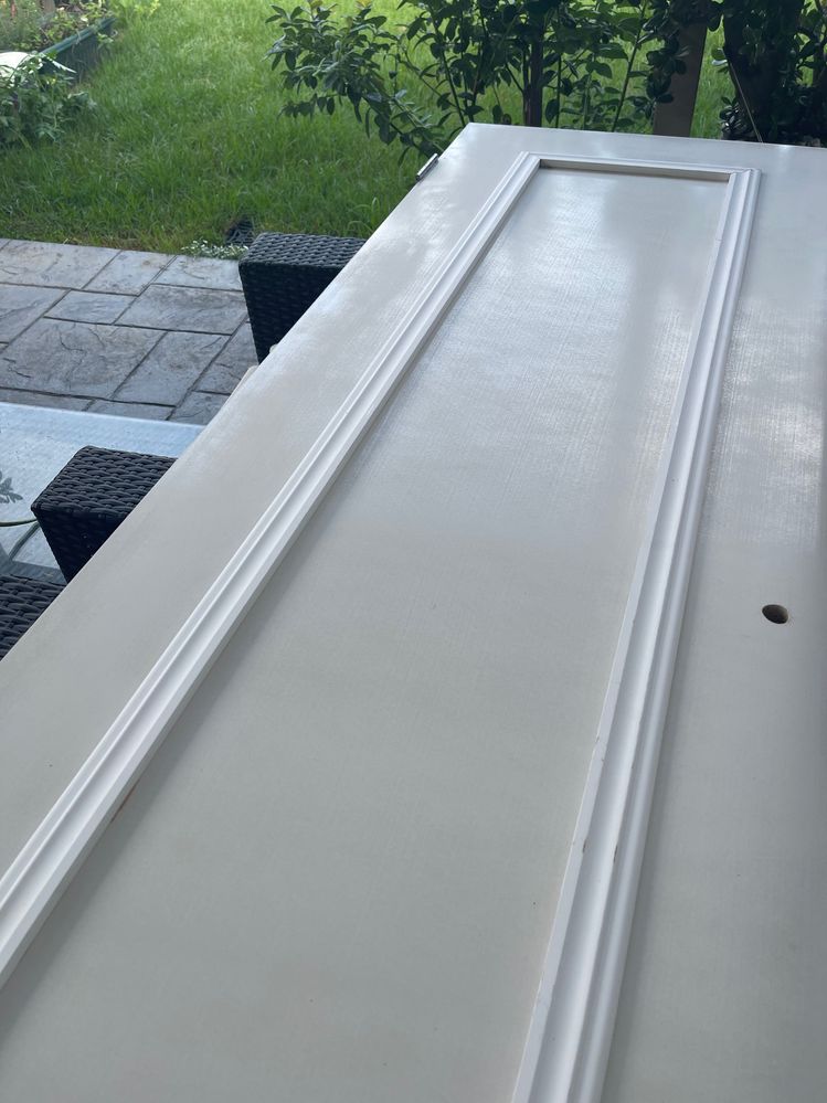 Once the doors were laying flat outside, I started off by giving them a clean with sugar soap and water to remove any marks and residue. Once clean and dry, I then proceeded to give the doors a sand using our hand sander. The doors were originally painted with a gloss paint which can be hard to paint over so by sanding them, it helped to remove the gloss and provide a better starting point for the project.