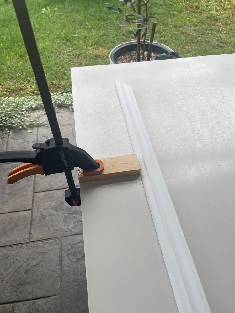 It is essential to ensure the ends of each piece are cut on an angle to ensure they will interlock with each other to create seamless corners. We used liquid nails to stick the wainscotting to the doors and allowed this to dry overnight.
