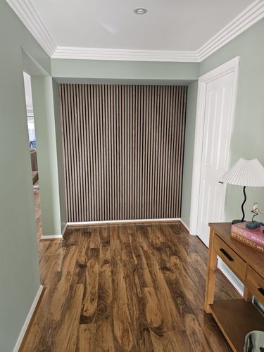 7. Installation: Measured, cut, and fitted timber panels to feature walls.