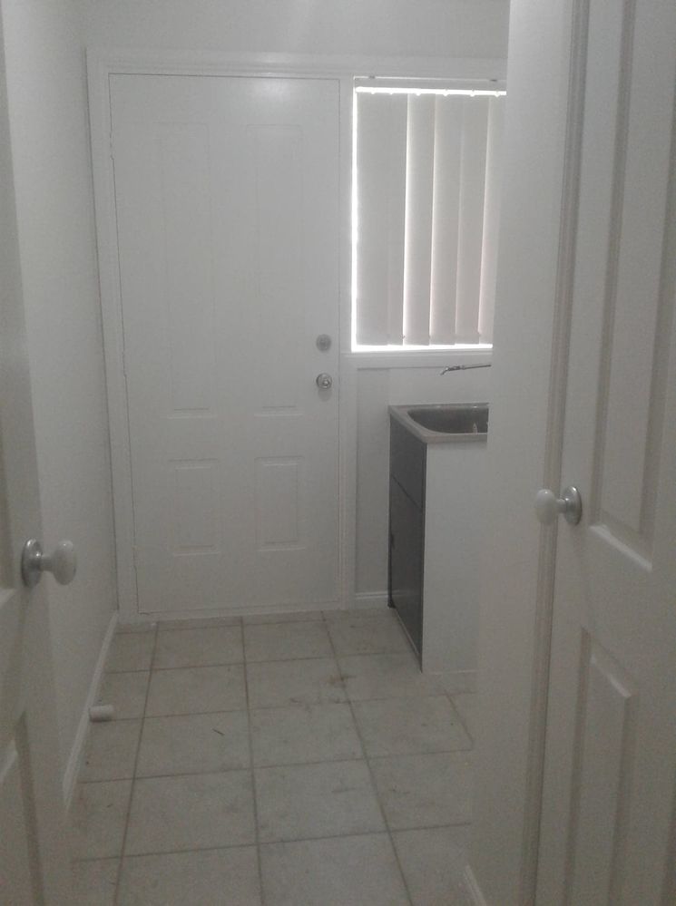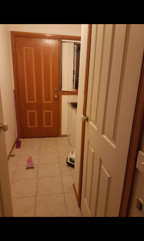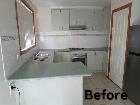 All kitchen and bathroom cupboards were sanded, primed and painted with White Knight Tile and Laminate.