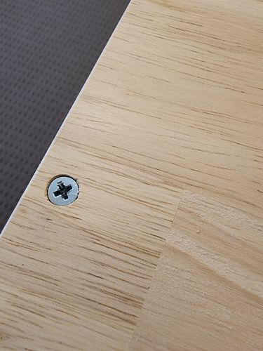 I discovered that rubber wood is a medium soft (or hard?) wood that splinters easily, so had to lower the drill speed. Had a couple of minor splinters like this, which were patched up with wood putty.