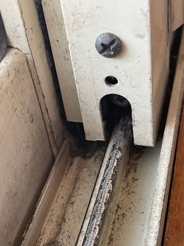 Sliding doors are typically removed by pushing them up against the top frame and then pulling the bottom out of the track. It's a two-person job, and you should take great care when handling the glass door. Make sure to wear appropriate PPE, including gloves, safety glasses, a long-sleeved shirt and pants and enclosed shoes.