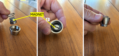 The photos below show the order of assembly. The magnet must be positioned centrally to the outer curved metal cover. It will magnetise to it. Then the spring. The door stop ball, needs to nest perfectly central to the curve of the door side magnet.