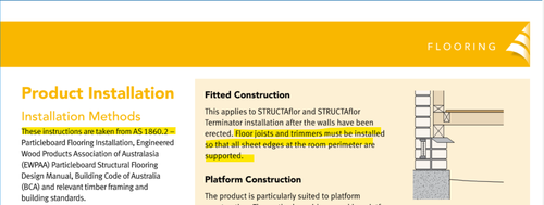 But after reading what i have, im a bit more concerned about the lack of support. The installation manual mentions trimmers are recommended, but more concerningly also mentions that this approach is supported by AS1860.2. Unfortunately i cant find a free version of hte standard to actually confirm it, or see if there are reasonable exceptions (for existing structures, old houses, joist width, etc.)