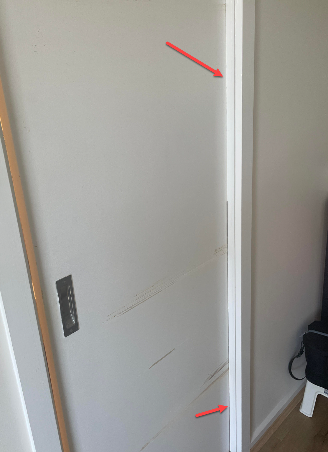 In short, our property has two almost-identical white wooden sliding doors separating each of the bedrooms from their respective en suites. As the below image makes clear, these doors appear to be scraping the door frame (or something in the space recessed within the wall) in a number of places leading to lifted paint and gouges in the body of the door.